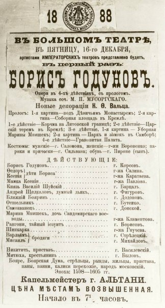 On March 21st we mark the 175th anniversary of the great composer Modest P. Mussorgsky, who reformed music art. Feodor I. Chaliapin wrote: "I hope that no one will blame me for patriotic pretension if I say that I consider Mussorgsky to be the greatest genius for the creation of realism in opera. Among those who came before or after him, Mussorgsky had no equal in terms of inspiration and creative genius. Words and sound fuse in his pieces; moreover, this fusion then coalesces with the reality". In our regular column "Invitation to the Museum" we publish rare materials that are housed at the Bolshoi Theatre Museum.The composer was born on the Karaevo estate not far from the city Toropets (Pskov Governorate) into a modest land-owning family. He studied at the Cadet School of Guards in Saint Petersburg. In 1856 he was raised from the ranks and received a commission with the Preobrazhensky Regiment. In the second half of 1850s, influenced by Darzomyzhsky and especially Balakirev, Mussorgsky decided to devote himself to music. In 1858 he resigned his commission and started his music education. In 1863 together with a group of around him the composer organized the "commune", following the model of free comradely living together that was described by N.G. Chernyshevsky in his novel "What is to be Done?" In the second half of 1860s Mussorgsky communicated intensely with his "Mighty Five" colleagues: Balakirev, Rimsky-Korsakov, Borodin and Cui. Mussorgsky's creative work developed mostly in the sphere of vocal genres - opera, romance and song. Most romances described scenes from ordinary people's lives ("Kallistrat", "Sleep, Sleep, Peasant's Son", "Darling Savishna", "The Orphan", "Hopak" and others). Later he created vocal cycles that were more sophisticated in terms of content: "Sunless" (1847) and "Songs and Dances of Death" (1877). His instrumental heritage is not large and is limited to a few numbers. However, such pieces as the symphonic fantasy "The Night of the Bold Mountain" (1867) and the suite "Pictures at an Exhibition" (1874) are extremely popular. His early operas were "SalammbГґ" (1863-1866) and "The Marriage" (1868). He then wrote the folk music dramas "Boris Godunov" and "Khovanshchina" (1869-1872), where he turned to the decisive moments of Russian history and portrayed peasants' revolts. Mussorgsky used cruel realism to show the contradictions of Russian reality in those times; he portrayed different aspects of ordinary people's lives, including all hardships, impenetrable misery, grief and the awakening of great protest forces. His art is humanistic. It was like a bell that called to fight for liberation of the people. "I want to create a nation: I dream of it, I think about it when I eat and it appears in front of me as I drink; one united big nation, not sugarcoated and with no gold-leaf". The composer was working on "Khovanshchina" for the last nine years of his life. He was working on the comic opera "The Fair at Sorochyntsi" simultaneously. Mussorgsky is a master of the socio- psychological portrait. In his vocal music he uses the musical transformation of the people's vernacular, the melody of intonations and the rules of the Russian peasant song to show what his characters are. His music does not caress, it does not sing to sleep or delight, but rather demands complete concentration of physical and spiritual effort; sometimes it subdues; at the same time it unleashes such power and thrills such secret parts of one's soul that one hardly knew existed. This is the distinctive feature of his genius gift. In his letter to Stasov, Mussorgsky wrote: "The most subtle features of human nature and crowds of people; to investigate those little-investigated countries thoroughly and to conquer them - this is an artist's real passion". Mussorgsky's creative career was not very successful in terms of official recognition. He was not surrounded by students, waiting for the wisdom of ultimate truth. On the contrary, others often tried to mentor him and blamed him for "dilettantism that is daring and self-conceit", as well as for "technical weakness". The last thing that this genius musician, who valued creative work as much as his own life, worried about, was immortalization of his creations. Perhaps, this is why many considered that what was left after Mussorgsky's sudden death was just a bunch of raw material, rather than a structured "artistic legacy". It took almost a century to understand: every note, which was written by the composer, is a part of the world that is as valuable as his personality was. Mussorgsky left people not material for a monument, but "the whole of himself". Mussorgsky's genius for innovative creative work influenced music in Russia and all over the world greatly.