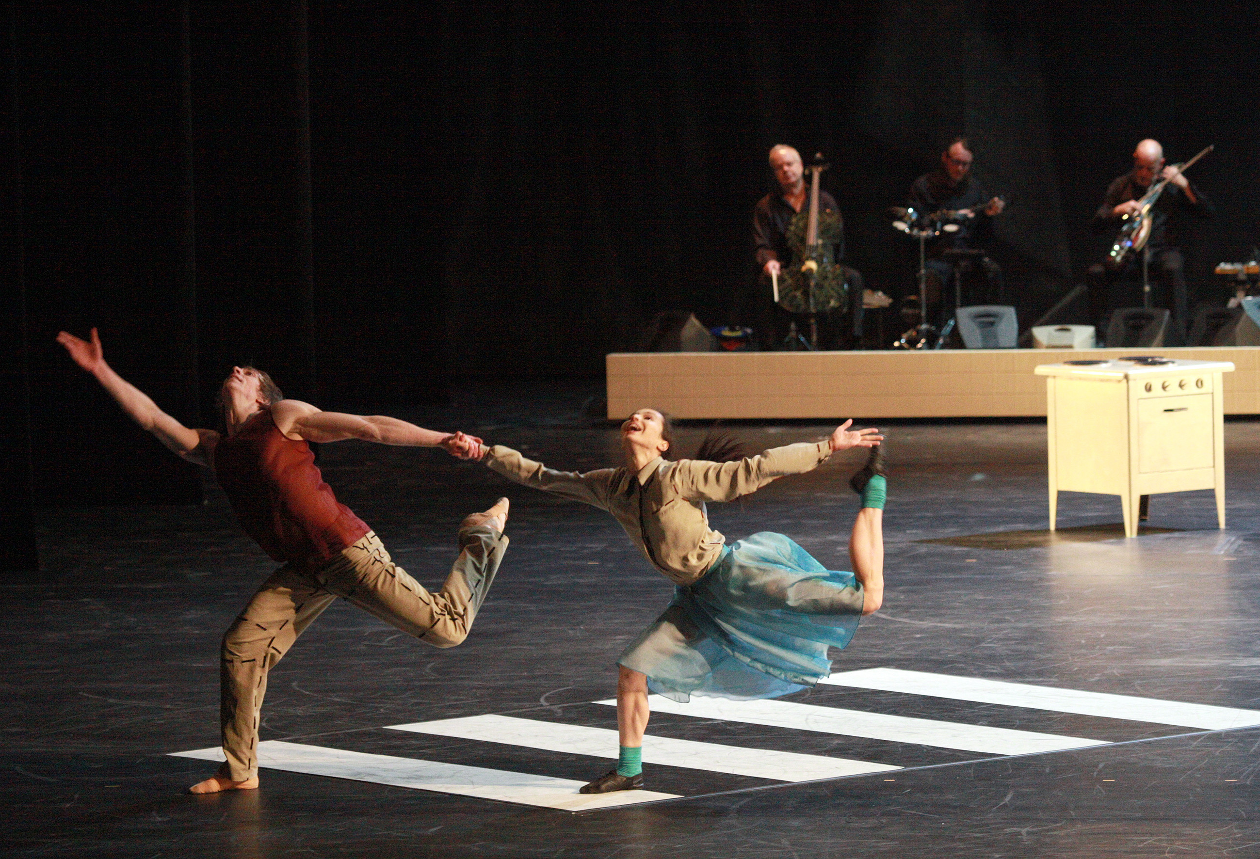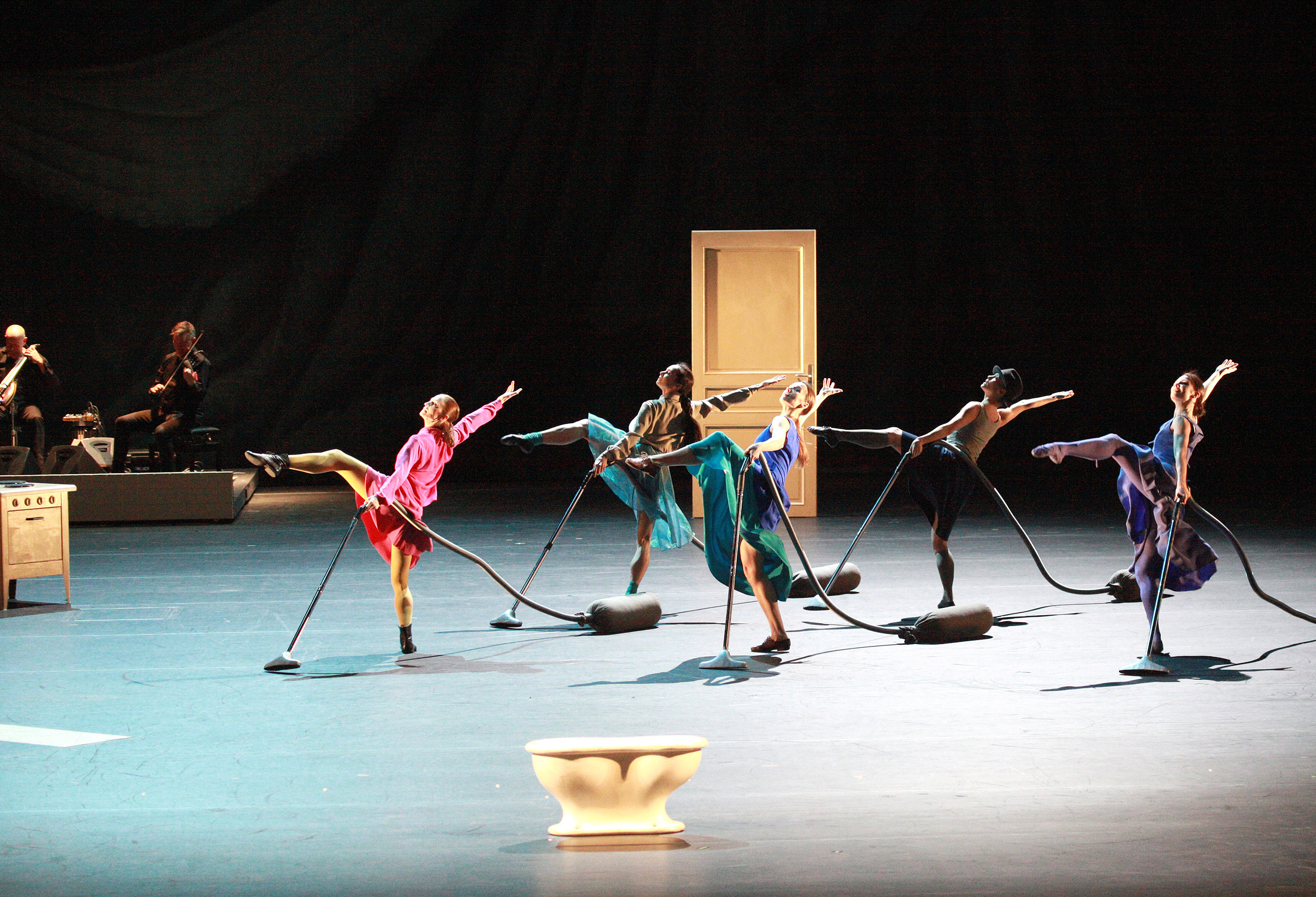 The name “Appartement” comes both from the word for a living space but also from associations with separation and isolation. The choreography is divided into sections (The Bathroom, The Television, The Pedestrian Crossing, The Kitchen, Children’s Games, Waltz (Four Couples), March of the Vacuum Cleaners, Duo of the Embryos, Grand pas de Deux, Safety Barriers and This Division) and, from the outset, they allow a glimpse of the humour and the subtext inherent in this choreography.