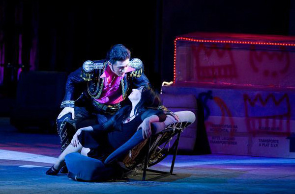 Act IV A square in front of an arena where a bullfight is about to start. Carmen and Escamillo arrive together, they are happily in love. Frasquita and Mercédès warn Carmen to beware of José, but Carmen is intrepid. She stays behind the crowd and meets José face to face. José implores Carmen to go with him and love him again, but she is adamant: her heart belongs to another. Desperate and enraged, José kills Carmen.