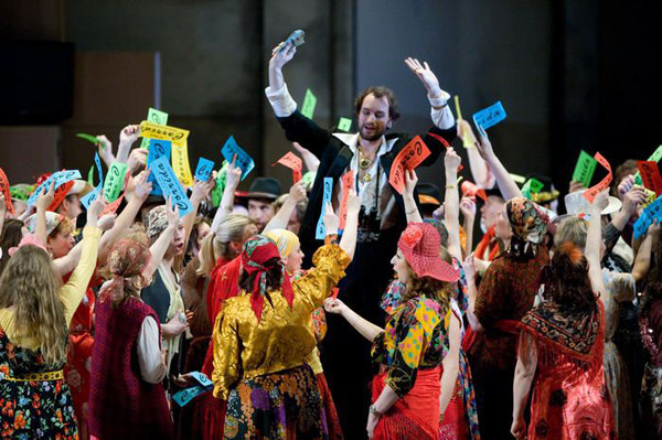 Act II Gypsy girls entertain the soldiers at Lillas Pastia’s. Escamillo the toreador praises his dangerous trade, and is in his turn praised by the enrapt crowd. Escamillo is captivated by Carmen, but she is not interested in him. The smugglers Dancaïre and Remendado arrive. They tempt Carmen and her friends, Frasquita and Mercédès, to assist them in a fat job. Carmen refuses: she is in love and awaits the soldier who was confined because of her. It is José, and he does not hesistate to keep their appointment once he is free. Carmen is happy to see him and eager to dance for him alone. A bugle call summons José back to the barracks. He intends to go, and Carmen annoyed with his obedience to command. Suddenly Zuniga, José’s senior, arrives at the inn. He goes after Carmen, but the smugglers interfere. Zuniga is overpowered, and José has to join the smugglers.