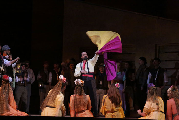 Act II Gypsy girls entertain the soldiers at Lillas Pastia’s. Escamillo the toreador praises his dangerous trade, and is in his turn praised by the enrapt crowd. Escamillo is captivated by Carmen, but she is not interested in him. The smugglers Dancaïre and Remendado arrive. They tempt Carmen and her friends, Frasquita and Mercédès, to assist them in a fat job. Carmen refuses: she is in love and awaits the soldier who was confined because of her. It is José, and he does not hesistate to keep their appointment once he is free. Carmen is happy to see him and eager to dance for him alone. A bugle call summons José back to the barracks. He intends to go, and Carmen annoyed with his obedience to command. Suddenly Zuniga, José’s senior, arrives at the inn. He goes after Carmen, but the smugglers interfere. Zuniga is overpowered, and José has to join the smugglers.
