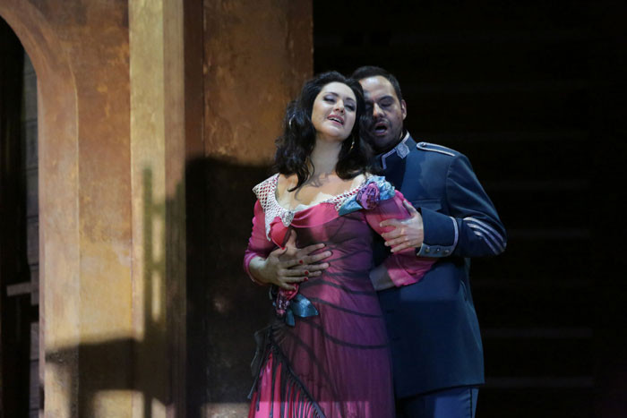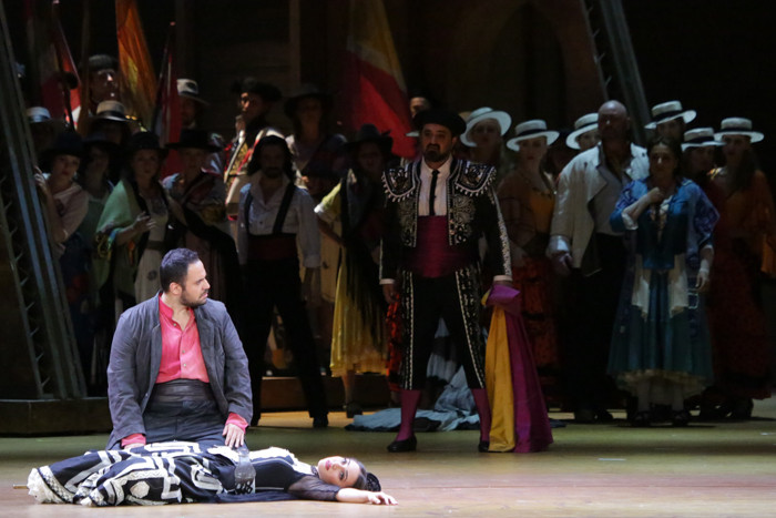 Act IV A square in front of an arena where a bullfight is about to start. Carmen and Escamillo arrive together, they are happily in love. Frasquita and Mercédès warn Carmen to beware of José, but Carmen is intrepid. She stays behind the crowd and meets José face to face. José implores Carmen to go with him and love him again, but she is adamant: her heart belongs to another. Desperate and enraged, José kills Carmen.
