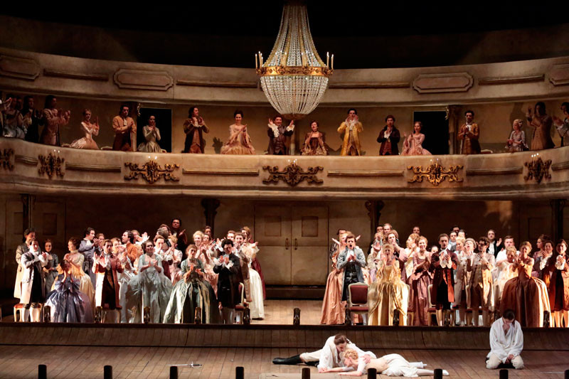 Fiordiligi is offended by her sister’s behaviour. However, she intends to flee her newly discovered love and decides to go to Guglielmo. She is trying on clothing left behind by Ferrando when the disguised Ferrando himself appears; Fiordiligi can resist him no longer. Don Alfonso explains the lesson that must be learnt from their experiences to the disillusioned men: such is women’s nature. Despina arrives with the message that the sisters are ready to marry the strangers and that the notary is standing by. A double wedding ceremony is improvised and both women have just signed the marriage contracts when Ferrando’s and Guglielmo’s return is announced. The supposed bridegrooms hide in an adjoining room — only to readopt their original characters and to give the sisters the fright of their lives at their supposed return. Don Alfonso shows them the marriage contracts. The boys react furiously, but the sisters beg for forgiveness. Ferrando and Guglielmo would love to believe them, but do not want to experience something like this ever again. Don Alfonso has won his bet: young people cannot arrive at adulthood emotionally unscathed.