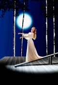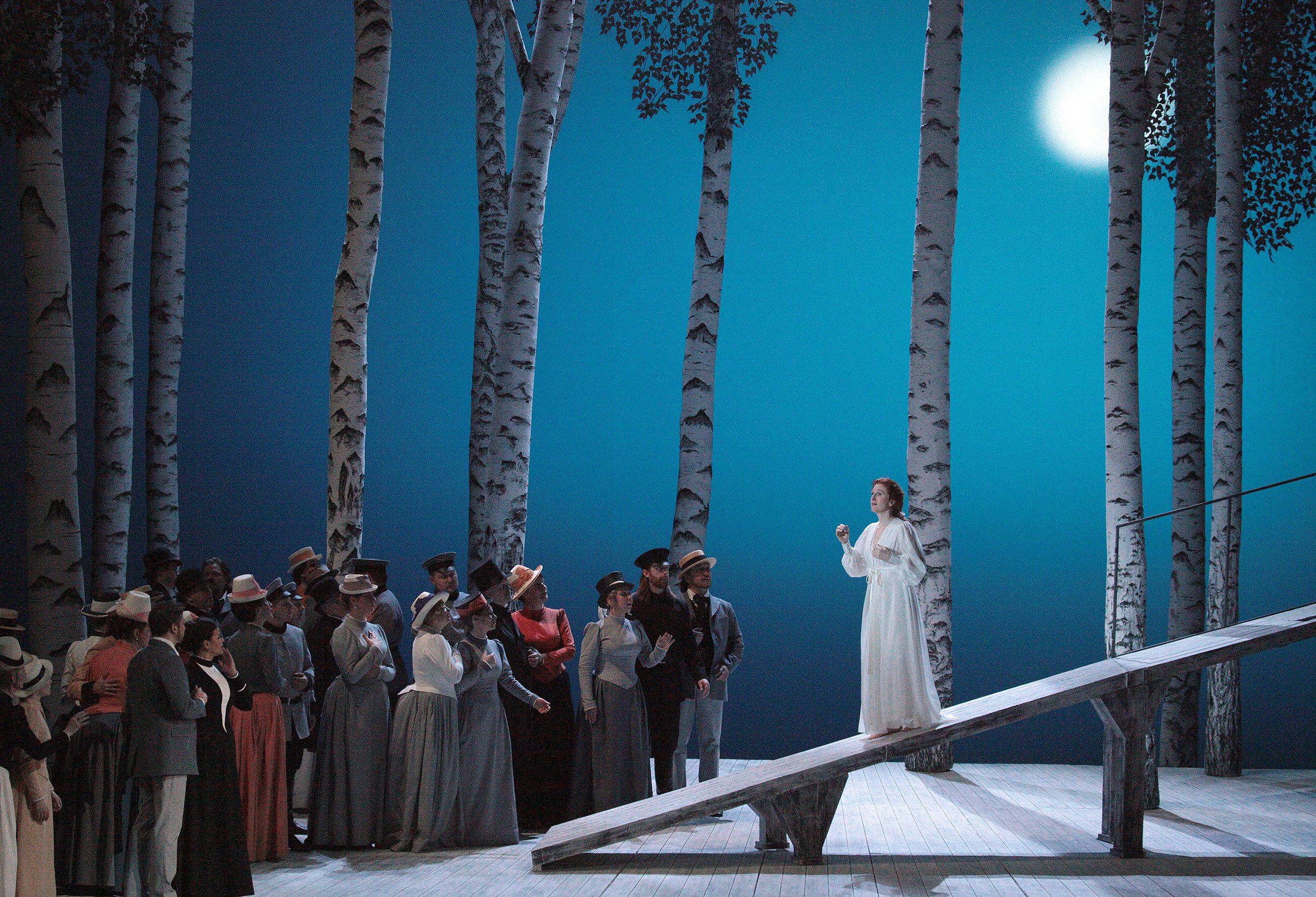 Teresa begs the villagers to be quiet, because Amina has at last fallen into an exhausted sleep. Learning of the impending marriage, she confronts Lisa, who says that she has never been found alone in a man's room. Teresa produces the handkerchief Lisa had dropped. The Count refuses to comment, but continues to assert Amina's virtue. Elvino demands proof, which is dramatically produced when Amina is seen walking in her sleep across the high, dangerously unstable mill bridge. Rodolfo warns that to wake her would be fatal, so all watch as she relives her betrothal and her grief at Elvino's rejection. When she reaches the other side safely, Elvino calls to her and she wakes to find herself in his arms, to the rejoicing of all.