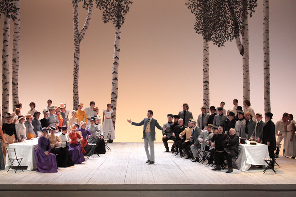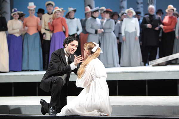 Lisa tells the stranger that he has been recognised as Rodolfo, the long-lost son of the count, and warns him that the village is preparing a formal welcome. Meanwhile she will be the first to pay her respects. She is flattered when he begins a flirtation with her, but runs out, dropping a handkerchief, when a sound is heard outside.