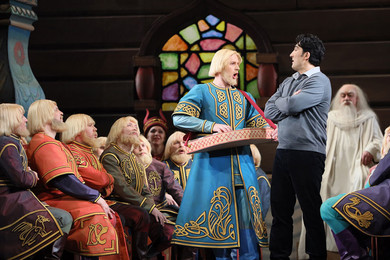 Sadko finds himself at the feast in a rich house of the Novgorod merchants’s guild. Guild leaders order a song in praise of heroic deeds. Nezhata, a young guslar, sings for them. Unable to hold his tongue at the table, Sadko admonishes the merchants for their clinging to the antique traditions and vain boasting. Affronted by Sadko’s accusations, the merchants angrily banish him from the feast.