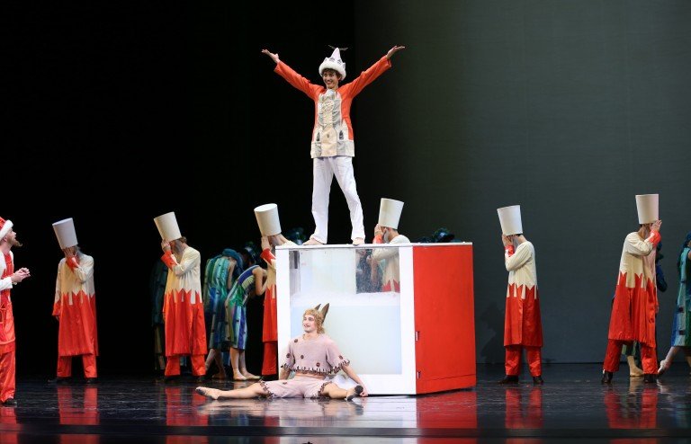 8. A square in the Capital City. The Tsar Maiden is invited to dance by the Tsar. The Tsar and Tsar Maiden dance. The Tsar tires quickly. The Tsar is old. Ivan appears with his Little Horse and the stone. The Tsar Maiden is pleased that Ivan is unharmed. The Gentleman of the Bedchamber is angry. The Gentleman of the Bedchamber takes the ring from Ivan. The Gentleman of the Bedchamber drives Ivan away. Ivan is not required any longer. The Tsar is ready to marry. But the Tsar Maiden is not. She does not fancy the Tsar for a husband. For a husband she needs a man as handsome as a picture. If the Tsar wishes to marry, then he must become such a fine fellow. But how? He must jump into a cauldron of boiling water, that’s how! The cauldron is brought in. The Tsar is in terror. How can he jump into boiling water? The Gentleman of the Bedchamber proposes the cauldron be tried out using Ivan. Ivan is pushed into the cauldron. The faithful Little Horse works a spell. Ivan is transformed into a handsome fellow indeed. Ivan becomes a Tsarevich. The people rejoice. The people are anxious. They all want to be young and beautiful; they all want to be tsars and tsarevnas. The Tsar orders all be kept back from the cauldron. The Tsar himself is immersed in boiling water. The Tsar perishes. The people mourn. The people bury the Tsar. The people find life hard without a Tsar. The people need a Tsar. Ivan Tsarevich and the Tsar Maiden are delighted. Preparations for the wedding are made. Then the people too are happy. The people will have their new Tsar. Handsome and young…