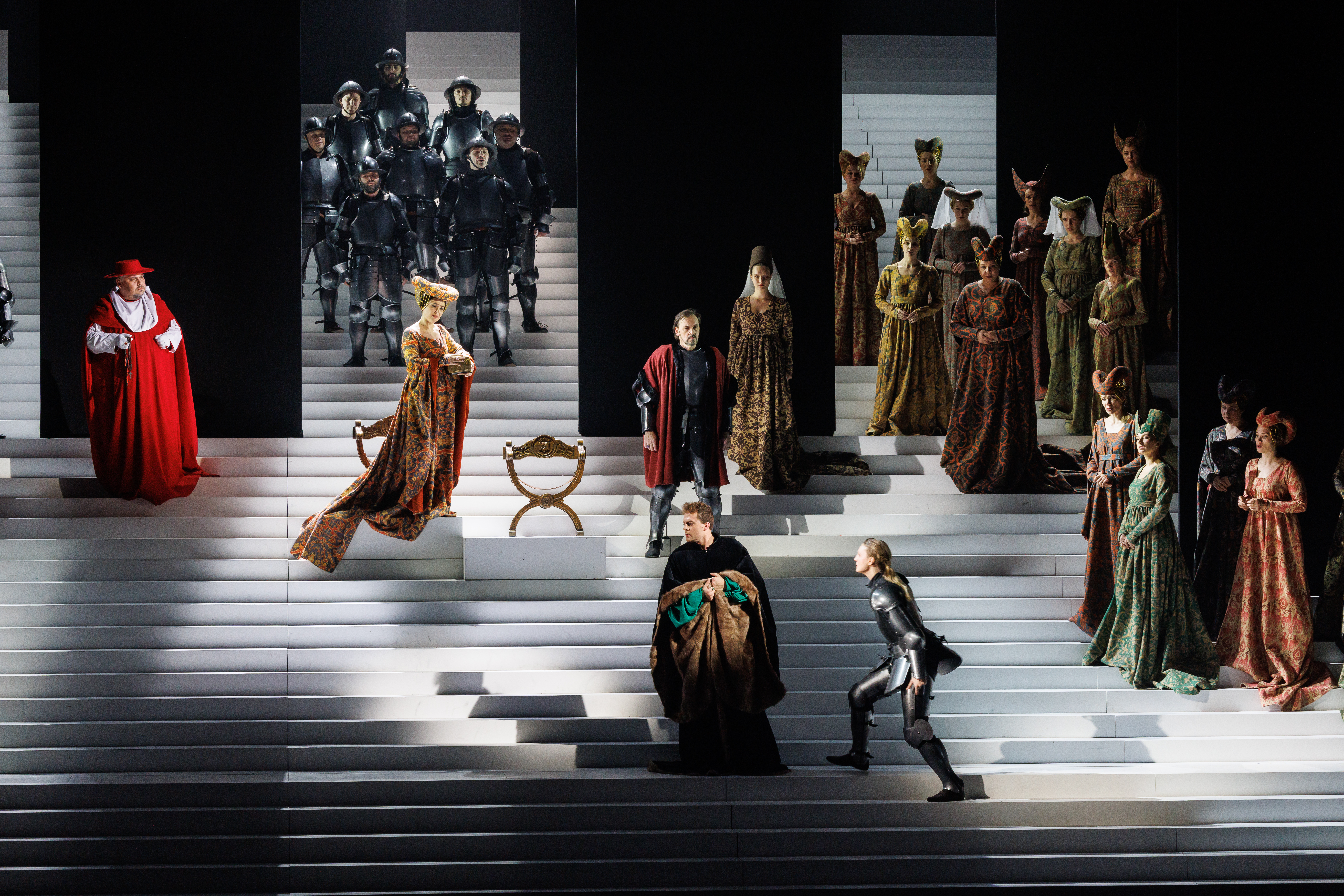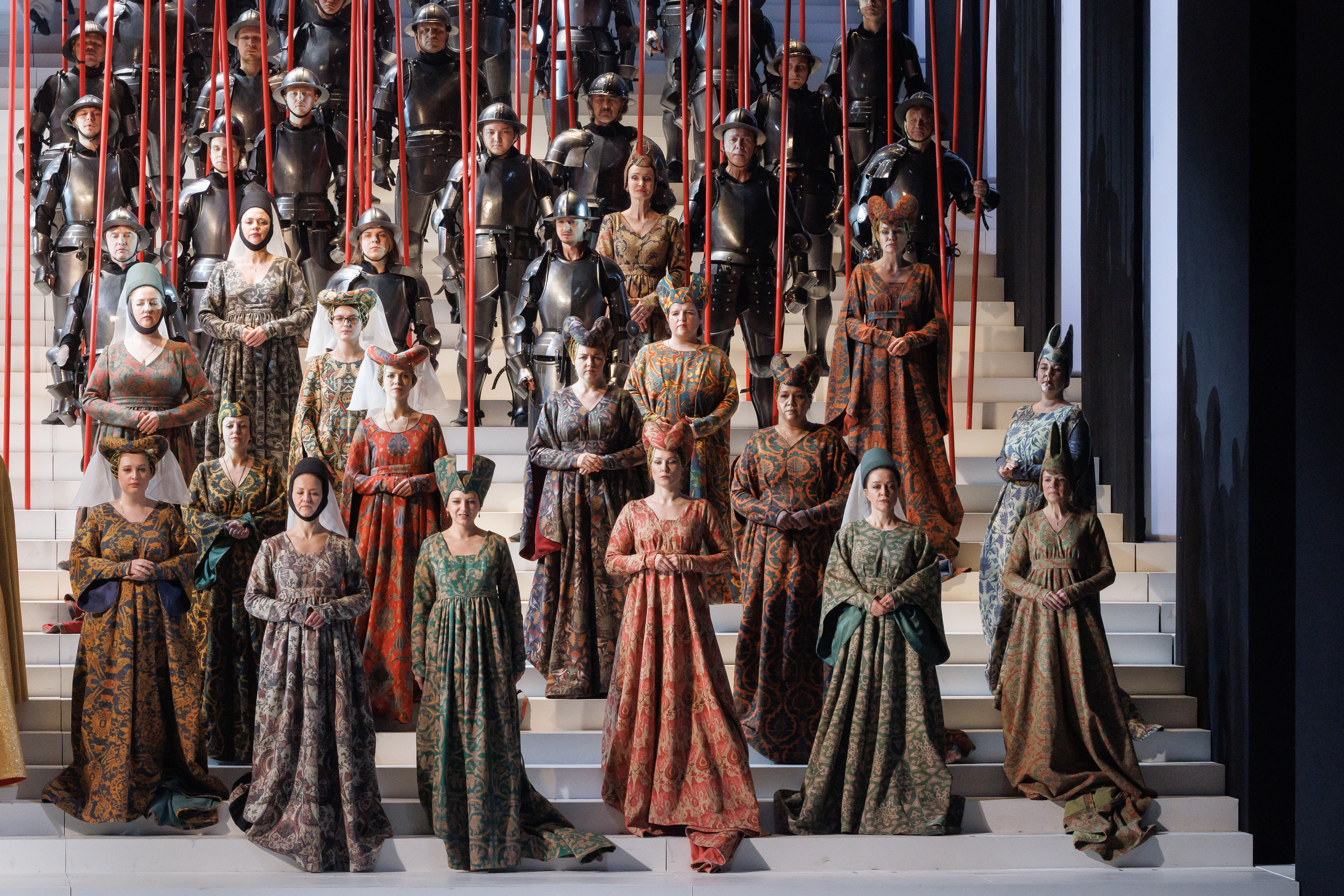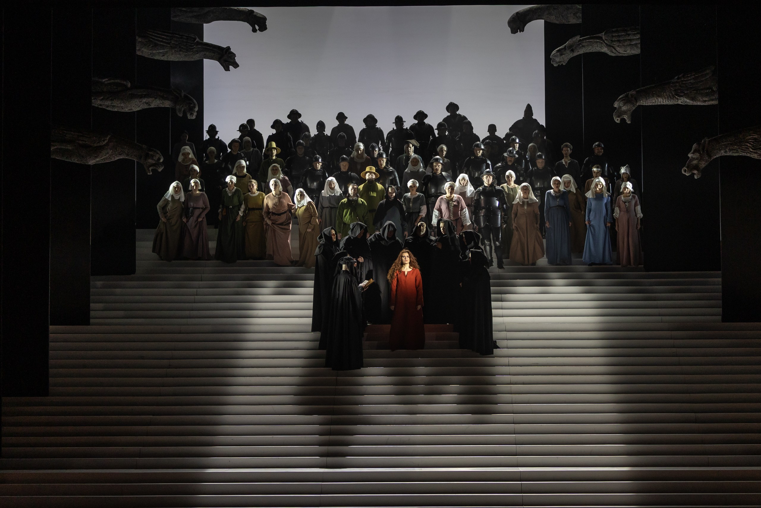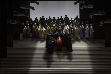 The coronation of Charles VII takes place in Reims. During the celebration, Thibaut and Raymond appear. Joan’s father, convinced that his daughter is allied with unclean forces, intends to expose her. Raymond vainly tries to restrain him. Thibaut publicly accuses his daughter. Joan, believing herself to have broken her vow, remains silent. The people’s adoration turns into hatred.
