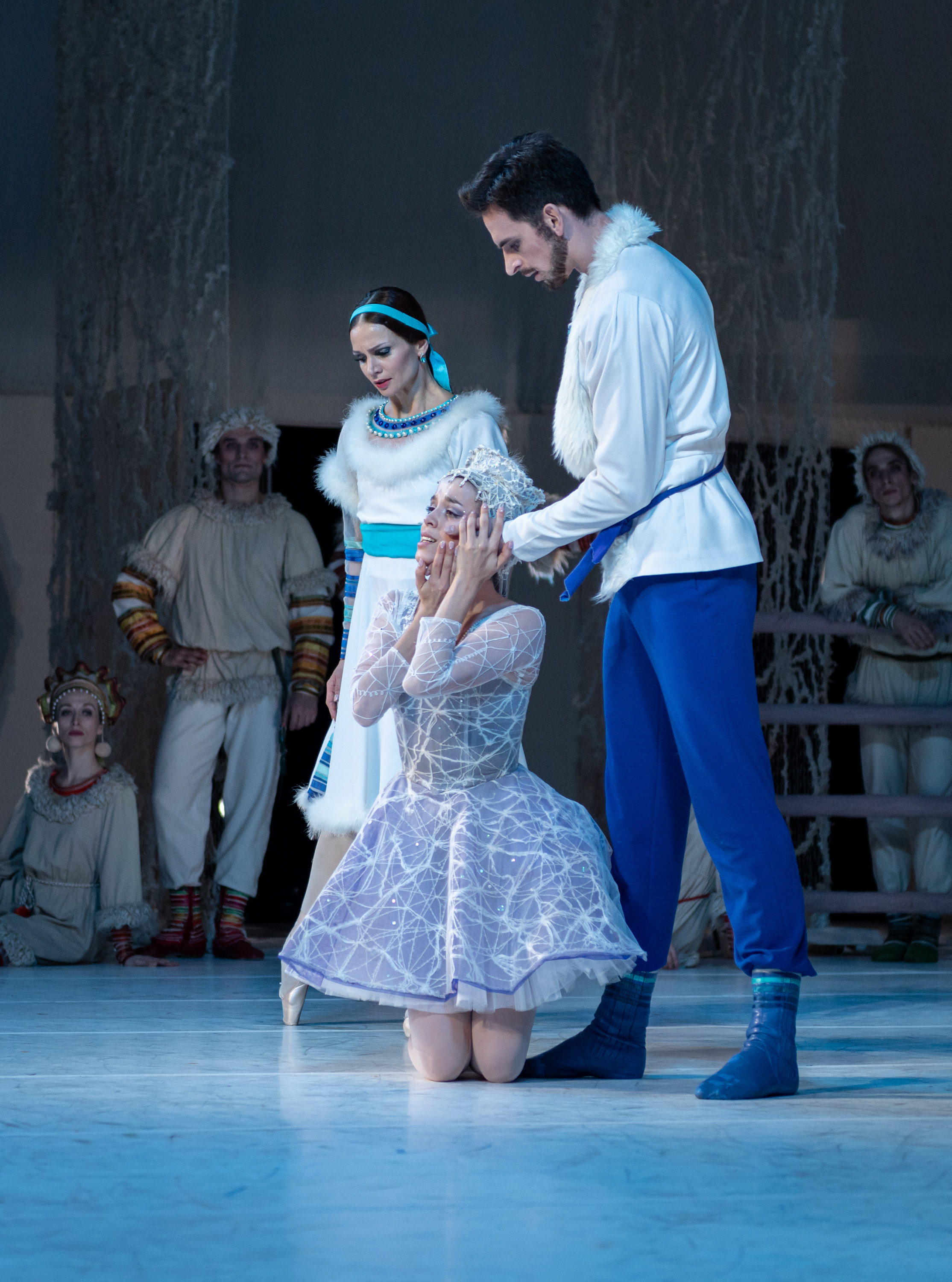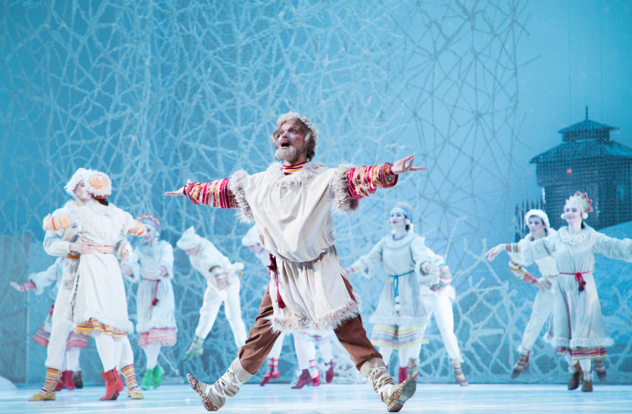 In a winter forest, the Snow Maiden plays with her friends, the Snowflakes. Their joyful dances delight Father Frost.