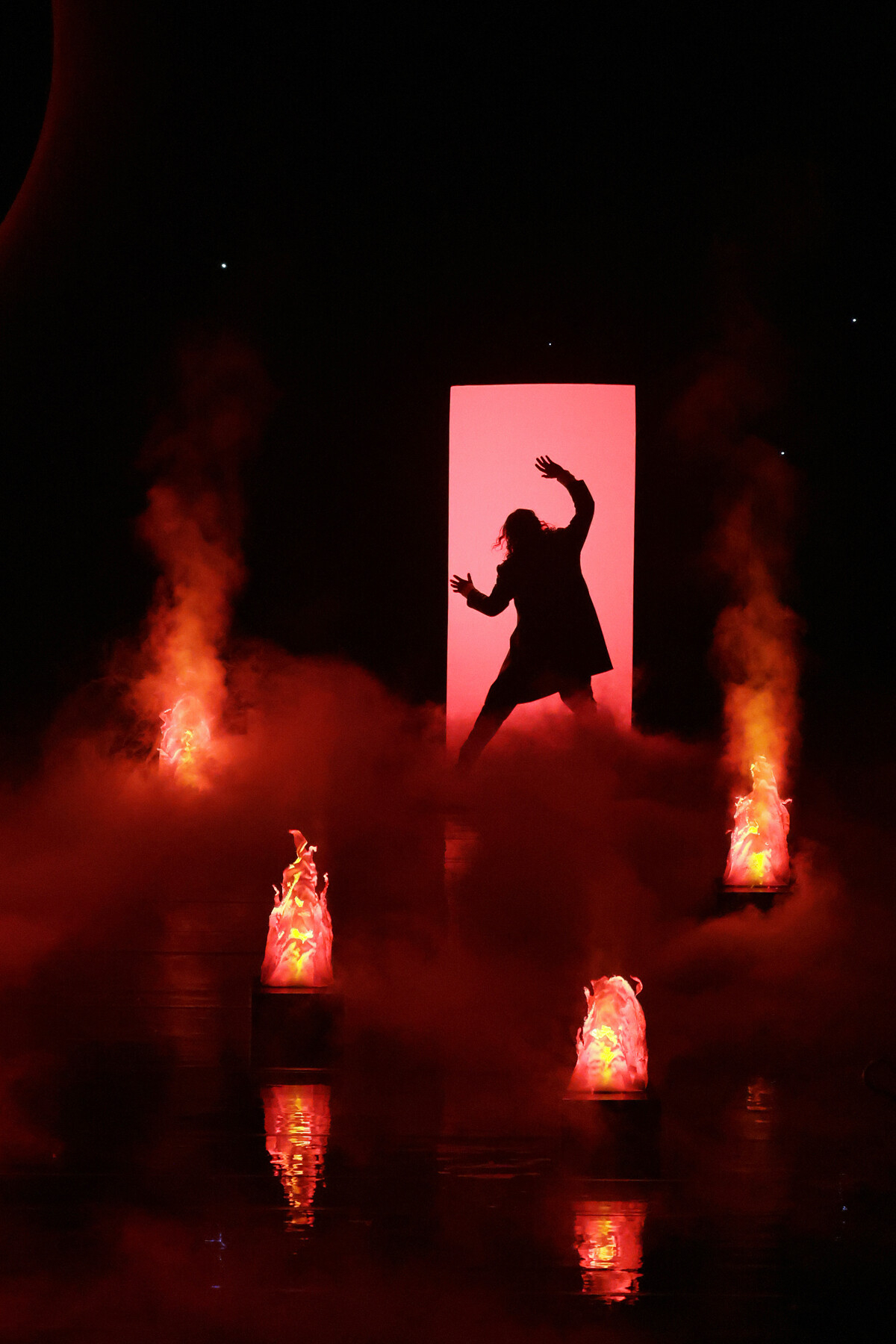 Don Ottavio, confirming to Donna Anna that Don Giovanni is soon to be punished by law, asks her if she feels she can now accept his proposal of marriage. But she is weary after recent events and begs him to be patient a little longer, though she again reassures him of her love. While Don Giovanni cheerfully dines, despite the appearance of Donna Elvira, who has come to get him to repent his sins, the statue of the Commendatore appears at the door. Leporello takes shelter under the table, while Don Giovanni confronts the grim apparition. After refusing the statue’s recommendations to repent, he is dragged down to Hell. To the assembled company, who have come to arrest the Don, Leporello recounts his master’s death.
