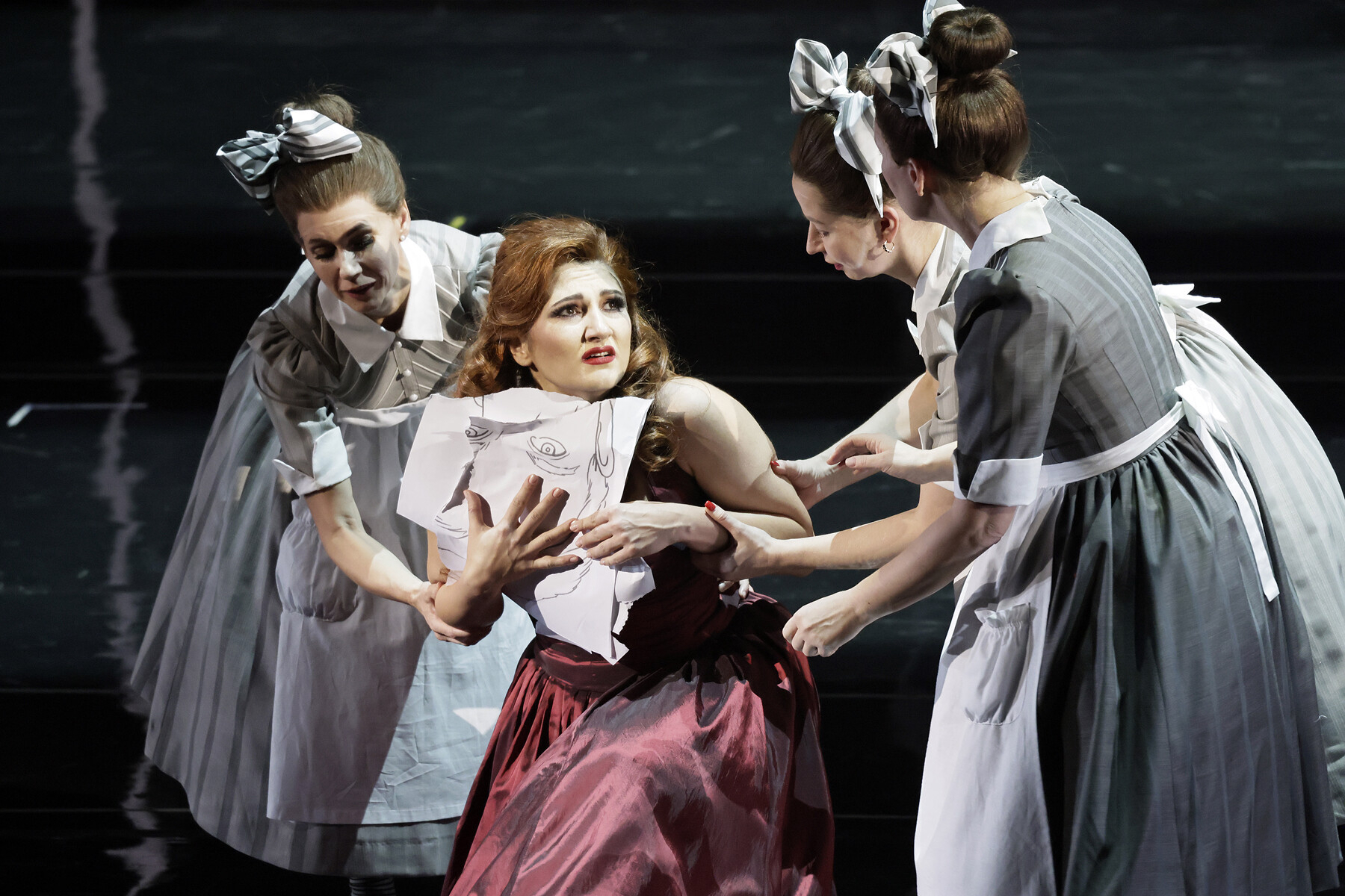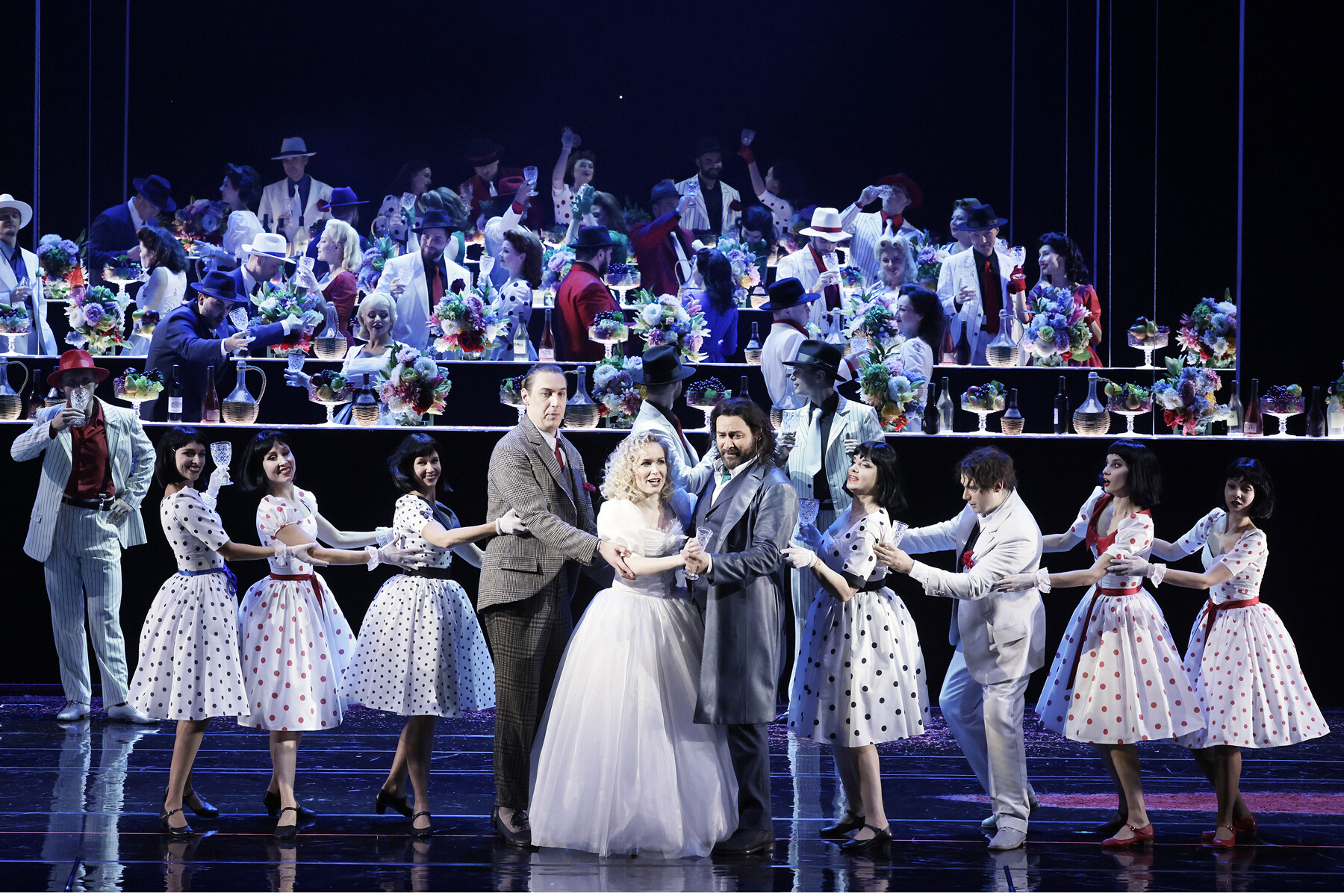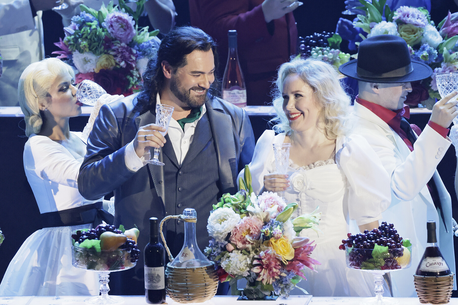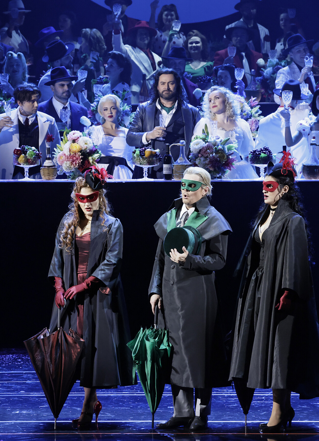 Masetto rebukes Zerlina for her unfaithfulness, but his bride soothingly reassures him that her virtue has not been offended by the amorous knight. Masetto however, when Don Giovanni arrives, hides in an alcove and spies on his advances to Zerlina. But the libertine, having noticed the bridegroom’s presence, promptly invites him and Zerlina to the ball. Three masked figures – Don Ottavio, Donna Anna and Donna Elvira – now enter in search of Don Giovanni, who does not recognize them and invites them too to the party. During the festivities Don Giovanni attempts to seduce Zerlina, but his plan is thwarted by the arrival of Donna Anna, Don Ottavio and Donna Elvira. After trying in vain to put the blame on Leporello, and threatening everyone insight, Don Giovanni vanishes.