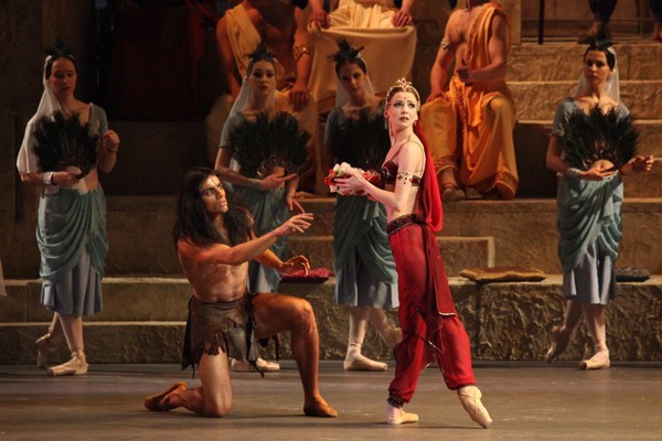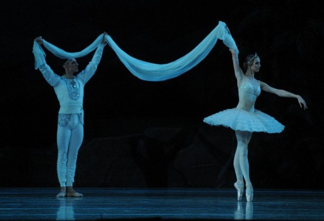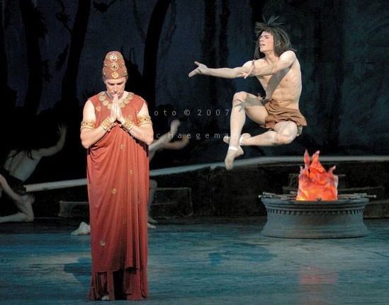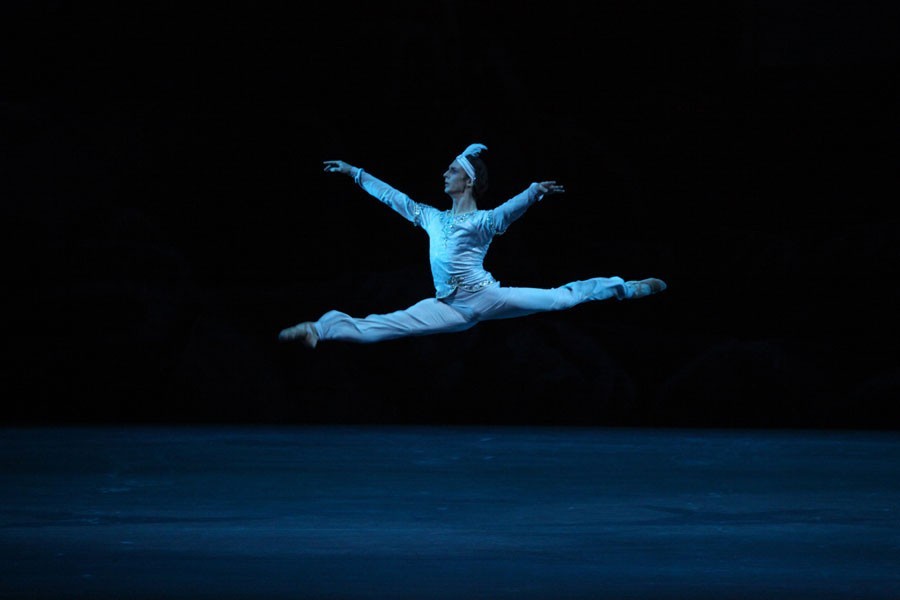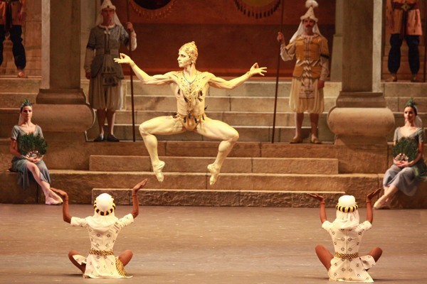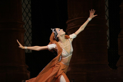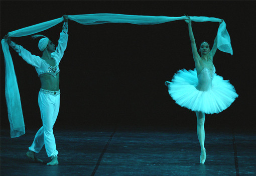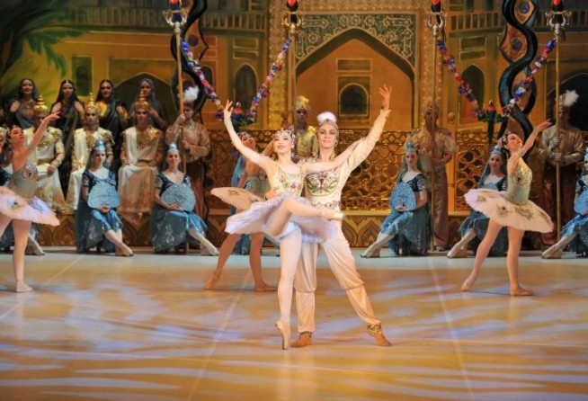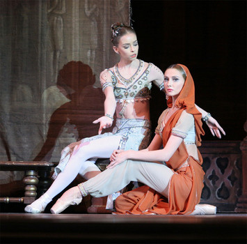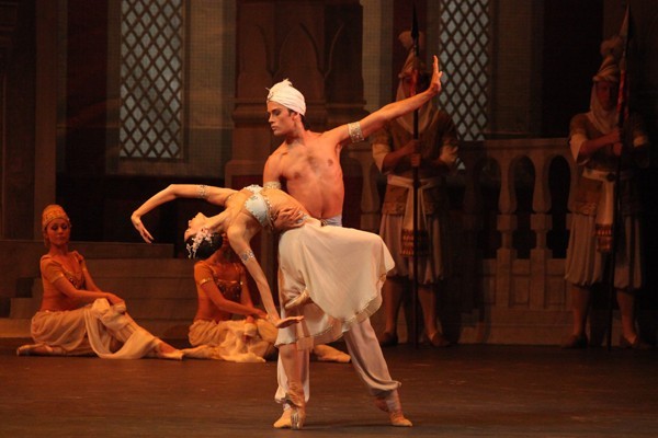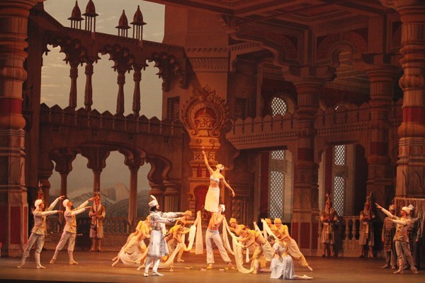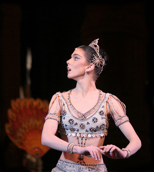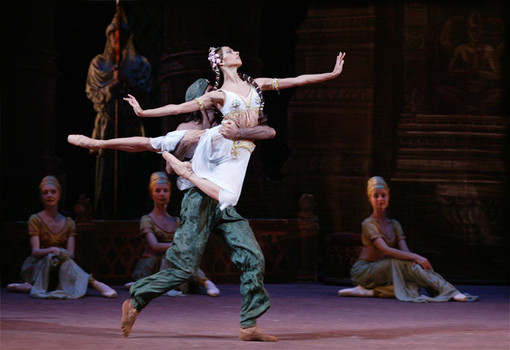 In1941, the whole ballet was fundamentally re-edited with additional new dances by Vladimir Ponomaryov and Vakhtang Chabukiani. For himself and Natalia Dudinskaya (Nikia), Chabukiani created a duet-meeting between the two main characters in Act 1, and an extended wedding pas, for Solor and Gamzatti, including a male variation, in Act 2, making use here of part of the music for the discarded, final act. The ballet ended with the hero’s suicide. But this scene was subsequently to be replaced by another – Solor was left with the Shades. In 1948, Nikolai Zubkovsky mounted for himself the virtuoso Bronze Idol variation, and Konstantin Sergeyev – th eduet for Nikia and the slave girl in the Rajah’s palace, when the bayadère came to give the Rajah’s daughter her blessing.