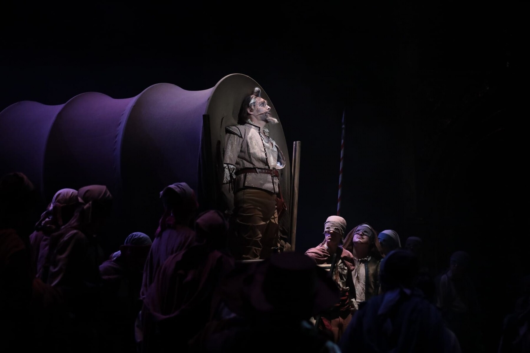Laughter and exclamations are heard as the crowd greets Don Quixote and Sancho Panza. Juan mocks the knight's ridiculous appearance and his glorification of the Beautiful Lady. Rodriguez, on the other hand, admires the beauty of the soul and the courage with which he protects widows and orphans. Don Quixote is unperturbed. The knight orders his squire Sancho Panse to distribute money to the poor and crippled. The crowd disperses. Sancho goes to the tavern. The night is coming.