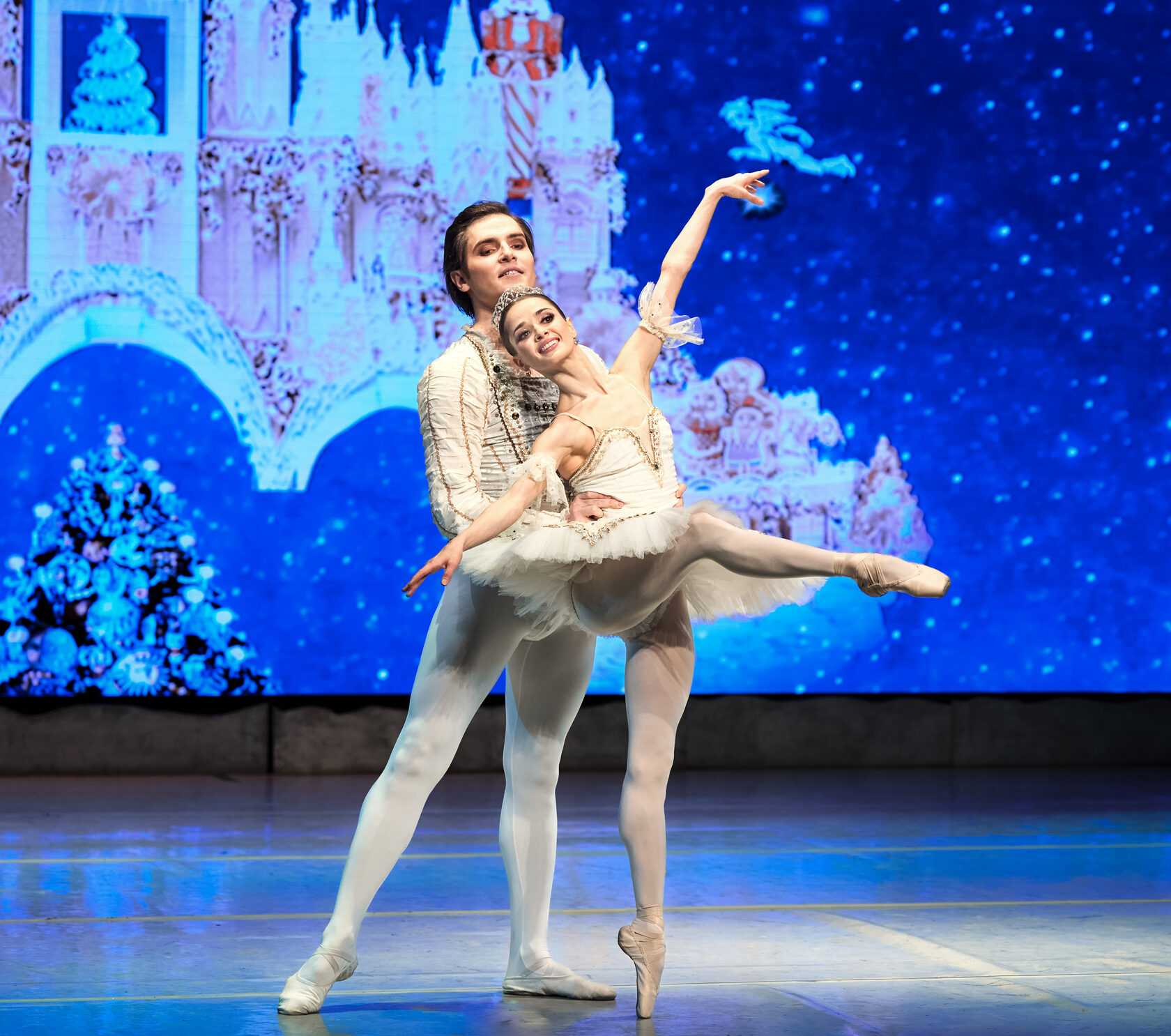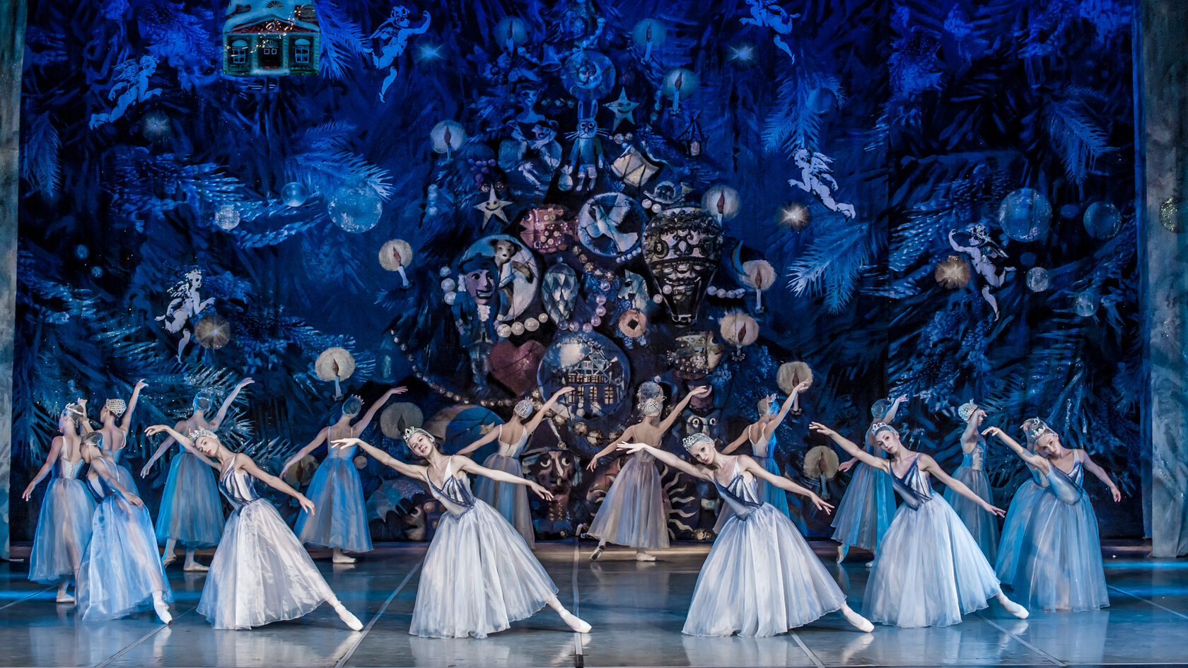 The walls of the house disappear. Marie and her friends are standing under a star-studded sky, by a fairy-tale Christmas tree. Snowflakes go round in a magical dance. Marie and her Nutcracker-Prince, beckon, as if to a beautiful dream, to the twinkling star at the top of the Christmas tree. They climb into a magic boat and set off for the top of the tree. The dolls follow behind them.