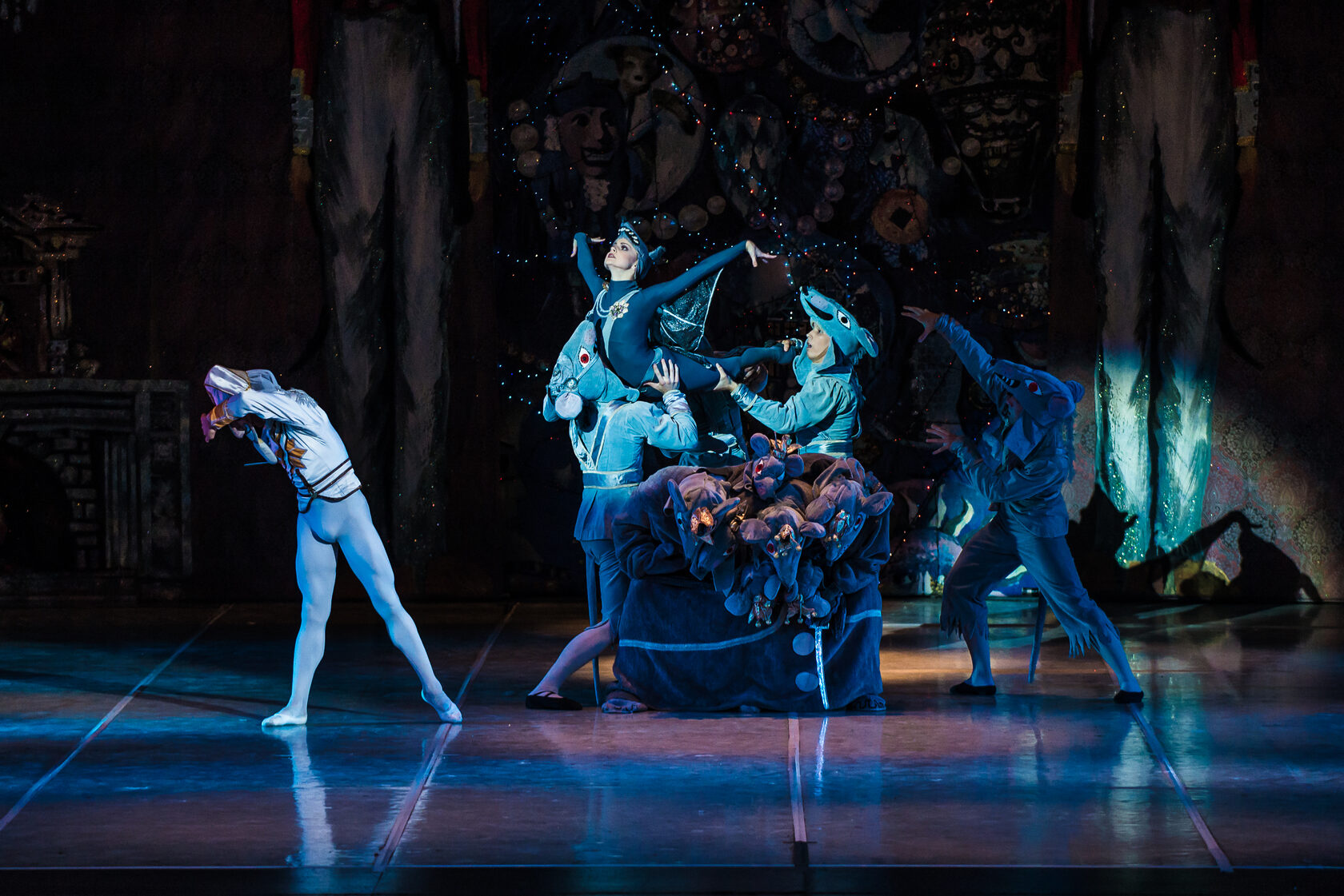 When working on the new production of The Nutcracker, Kasatkina and Vasilyov made the plot as dynamic as possible, populated it with characters from the original story as well as their own, and developed each personality in detail. Humor returned to the fairy tale — in all its Hoffmann-style grotesque charm. In short, this familiar story doesn’t let the audience get bored for a single moment: adults are surprised by the new plot twists, and children simply follow the adventures of their favorite characters. Immersion into Hoffmann’s world is ensured not least by the sets, costumes, and props: in Kasatkina and Vasilyov’s Nutcracker, the scenography is a special kind of theatrical magic. The offspring of Queen Mouserink with his seven heads invariably delights the youngest spectators.