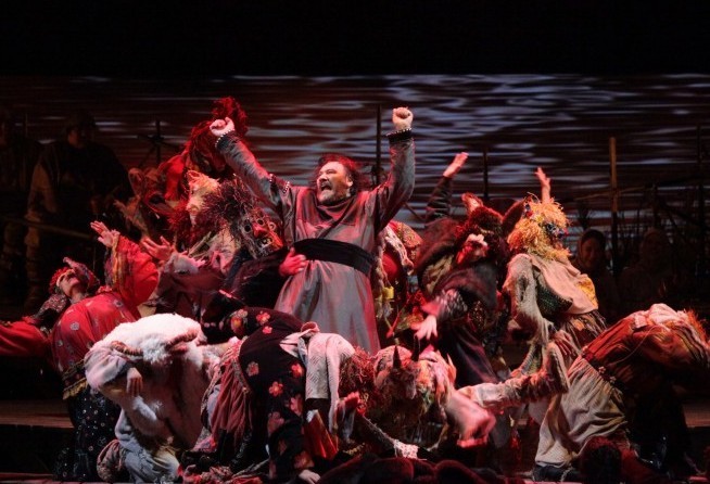 An angry mob breaks into the palace, demanding redress from the extortionate taxes that Mamyrov is exacting. The young prince Yuri calms them down and persuades them to leave. Mamyrov takes this opportunity to reveal to Yuri that it is Kuma who is responsible for his mother’s misery, and Yuri resolves to kill his father’s mistress.