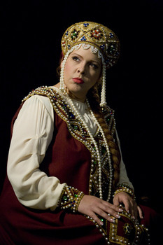 Marfa, accompanied by Dunyasha and Petrovna, the housekeeper, come out of the monastery gates. At the porch of her house, Marfa stands talking to her friend other betrothed, Ivan Lykov. Suddenly someone in a black monk’s cassock and skullcap appears through the monastery gates and walks slowly along the street. Marfa’s eyes meet those of the monk. She doesn’t recognize Ivan the Terrible but the stranger’s intent gaze frightens her. It is only when she catches sight of her father and her betrothed, who are approaching the house, that she calms down and forgets her weird encounter. Sobakin invites Lykin into the house and the girls follow them in. Dusk is falling. A shadow is circling round the Sobakin house. It is Lyubasha. She cautiously steals up to the porch: she wants to have a look at her rival. Having peeped through the lit-up window, Dunyasha clams down: "Is that Marfa? There is no need for me to worry then, Grigory will soon tire other!" But, peeping again through the window, Dunyasha realizes she has mistaken Dunyasha for Marfa. Dunyasha is struck by Marfa’s beauty. "He won’t fall out of love with her in a hurry. I’ll soon show her, though!"