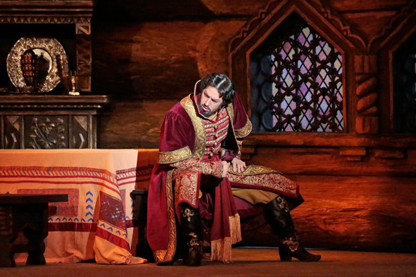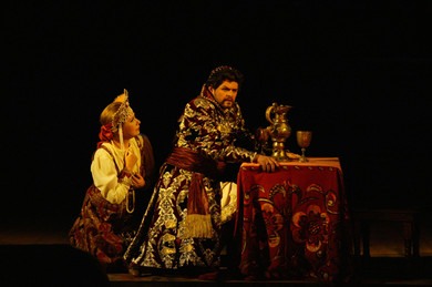 Chamber in Oprichnik Grigory Gryaznoy’s house. Grigory is desperate: he has fallen passionately in love with Marfa, daughter of the merchant Sobakin, but she is already betrothed to the young boyar Ivan Lykov. In order to put his love out of his mind, Grigory called some guests to a drinking-party. One of them is the Tsar’s foreign physician Bomelius, the other is Lykov.