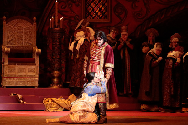 Gryaznoy appears, and Marfa comes out of her room, pretending to be well. Gryaznoy tells Marfa that Lykov had confessed to giving Marfa a potion, and that he, Gryaznoy, with his own hands had carried out the Tsar’s sentence. Learning of the death of her beloved, Marfa falls unconscious to the floor. When she recovers, she recognizes no one. Mistaking Gryaznoy for Lykov, she converses tenderly with him, recalling the happy days they have spent together. Shaken by Marfa’s words, Gryaznoy admits that he had slandered Lykov and that he was the one who gave Marfa the love potion. But Marfa doesn’t hear him at all, though. Gryaznoy is desperate with guilt. But before going to his trial, he wants to have his revenge on Bomelius. Lyubasha who has appeared in the palace, tells Grigory how she had substituted poison for the love potion Bomelius had given him, and which Grigory had then given to Marfa. Grigory kills Lyubasha.