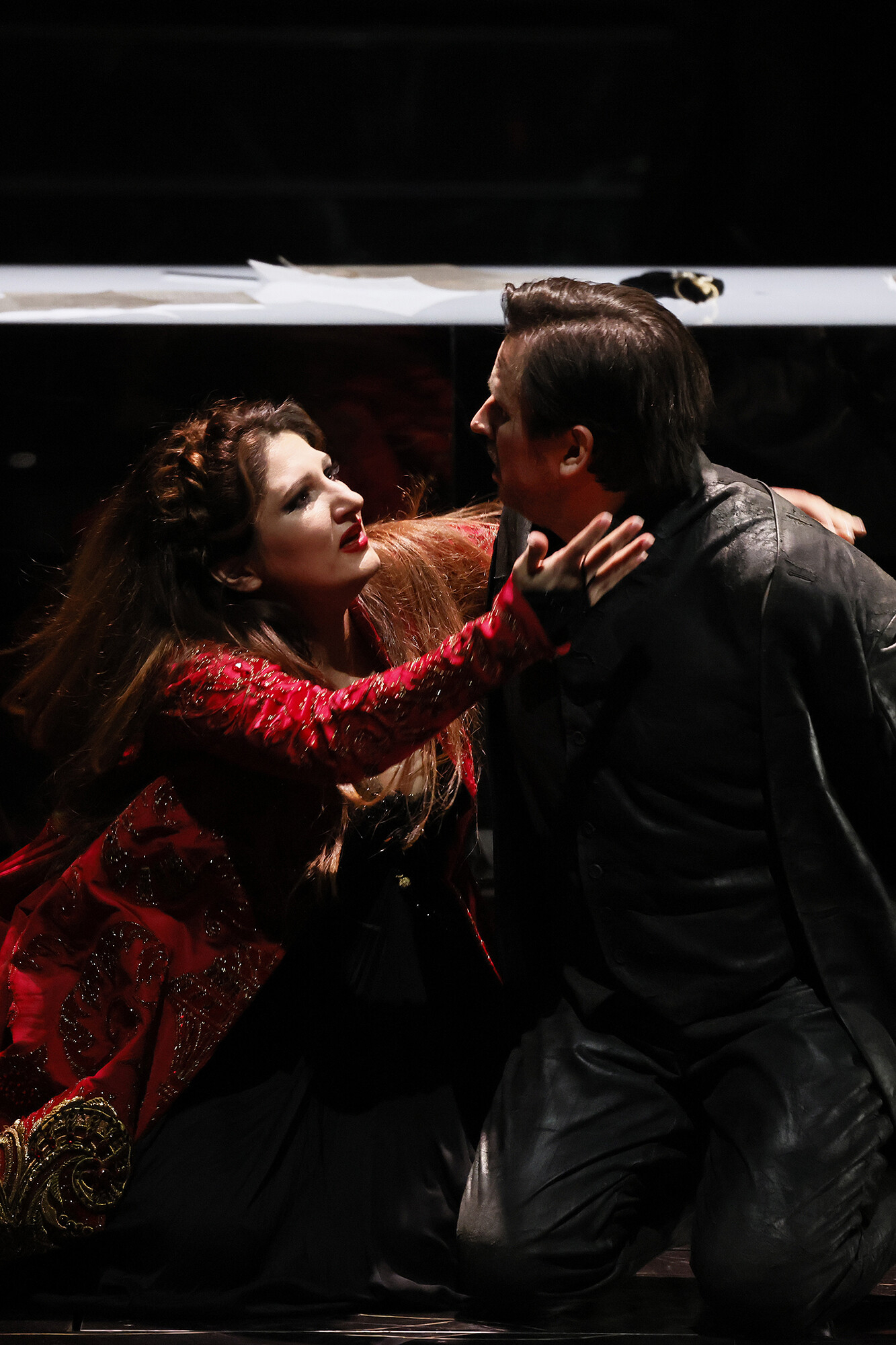 Scarpia prepares a document of safe-conduct for the lovers. When he embraces her, Tosca stabs him with a knife, wrenches the document from his fingers and, placing candles at his head and a crucifix on his chest slips quietly out.