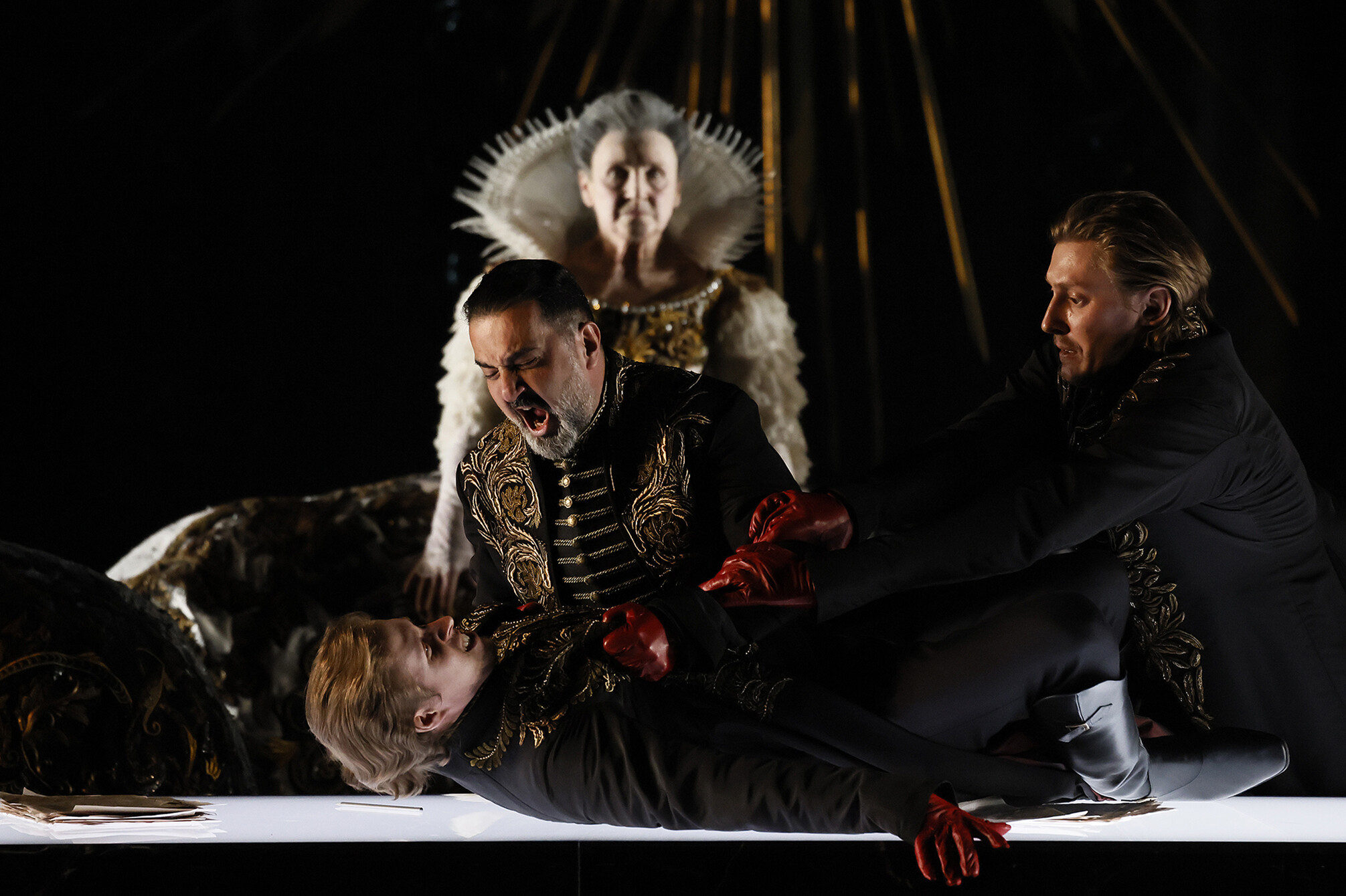 Mario is carried in; realizing what has happened, he rages at Tosca, but the gendarme Sciarrone rushes in to announce that Napoleon has won the Battle of Marengo, a defeat for Scarpia’s side. Mario shouts his defiance (“Vittoria!”).