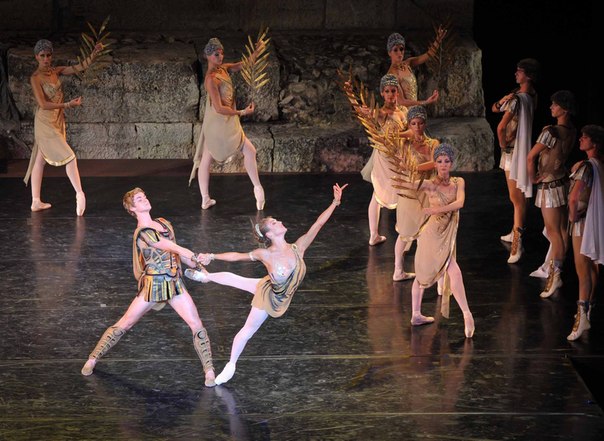The soloists of the Bolshoi theatre became guest stars in the performance of Yury Grigorovich's Ballet troupe in an ancient amphitheatre under the open sky in Athens. Maria Vinogradova (Phrygia), Yekaterina Shipulina (Aegina), Denis Rod'kin (Spartacus) and Alexander Volchkov (Crassus) took part in the "Spartacus"; Anna Nikulina (Giselle) and Ruslan Skvorcov (Albrecht) - in the "Giselle".